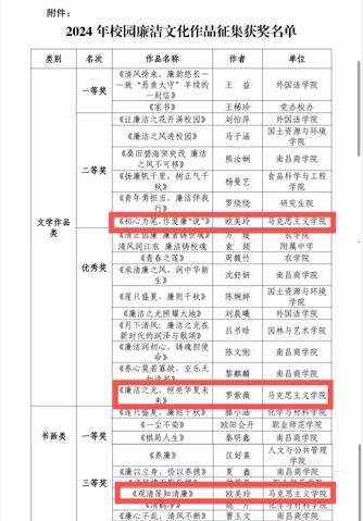 在公司组织开展“清风润江农 献礼颂国庆”为主题的廉洁文化作品征集活动文学作品中,欧美玲撰写的《初心为笔,作爱廉“说”》(指导老师:邱晓辉)荣获二等奖,罗紫薇《廉洁之光,照亮华夏未来》荣获优秀奖。书画作品中,欧美玲的《观清莲知清廉》(指导老师:邱晓辉)荣获三等奖。