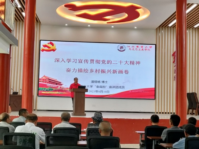 在葛田乡古田村新时代文明实践站,营队指导老师潘锡杨博士充分发挥专业所长,通过红色大讲堂作了题为“深入学习宣传贯彻党的二十大精神,奋力描绘乡村振兴新画卷”的宣讲报告。营队成员和古田村全体党员共二十余人聆听了报告。潘博士首先介绍了党的二十大召开的重要意义,指出党的二十大是在全党全国各族人民迈上全面建设社会主义现代化国家新征程、向第二个百年奋斗目标进军的关键时刻召开的一次十分重要的大会,是一次高举旗帜、凝聚力量、团结奋进的大会;其次,详细解读了二十大报告的主要内容,特别是从新时代十年的伟大变革中深刻领悟“两个确立”的决定性意义;最后,结合学习贯彻党的二十大精神“五个牢牢把握”和江西省第十五次党代会精神,对标乡村振兴目标要求,号召全体党员更加紧密地团结在以习近平同志为核心的党中央周围,聚焦“作示范、勇争先”的目标要求,奋力描绘乡村全面振兴新画卷,为全面建设社会主义现代化江西、全面推进中华民族伟大复兴而努力奋斗。