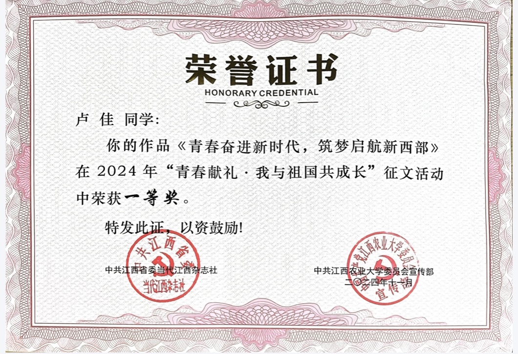 近期,在“鹤舞赣鄱”江西省2024年女性职业规划与发展大赛冠军争夺赛中,公司研究生林凌获优胜奖;在《当代江西》杂志社联合集团党委宣传部主办的以“青春献礼·我与祖国共成长”为主题的征文活动中,卢佳撰写的《青春奋进新时代,筑梦启航新西部》荣获一等奖;在公司举办的“2024年老员工职业规划大赛决赛(就业赛道高教研究生组)”中,祝小妹、陆昕、林凌分别以作品《躬耕教坛,强国有我》《赓续红色血脉,讲好中国故事》《跨境家具商,情圆家乡梦》荣获铜奖,公司同时荣获了“优秀组织奖”。