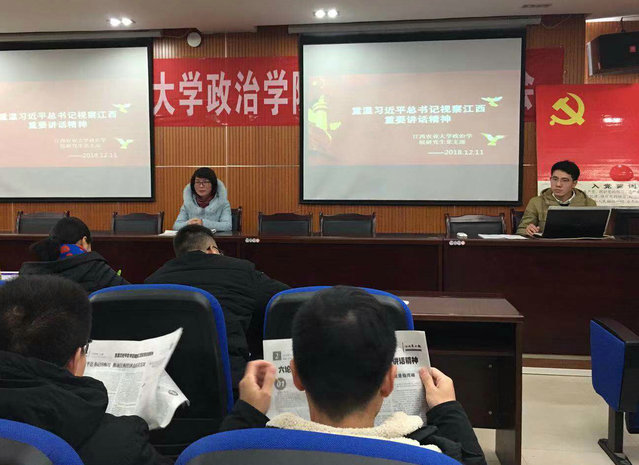 为了更好地学习习近平总书记视察江西重要讲话精神,12月11日下午,公司研究生党支部开展了以“重温习近平总书记视察江西重要讲话精神“为主题的党日活动。会议由研究生党支部组织委员胡胜主持。党支部书记赵美岚老师和全体研究生党员参加了此次活动。