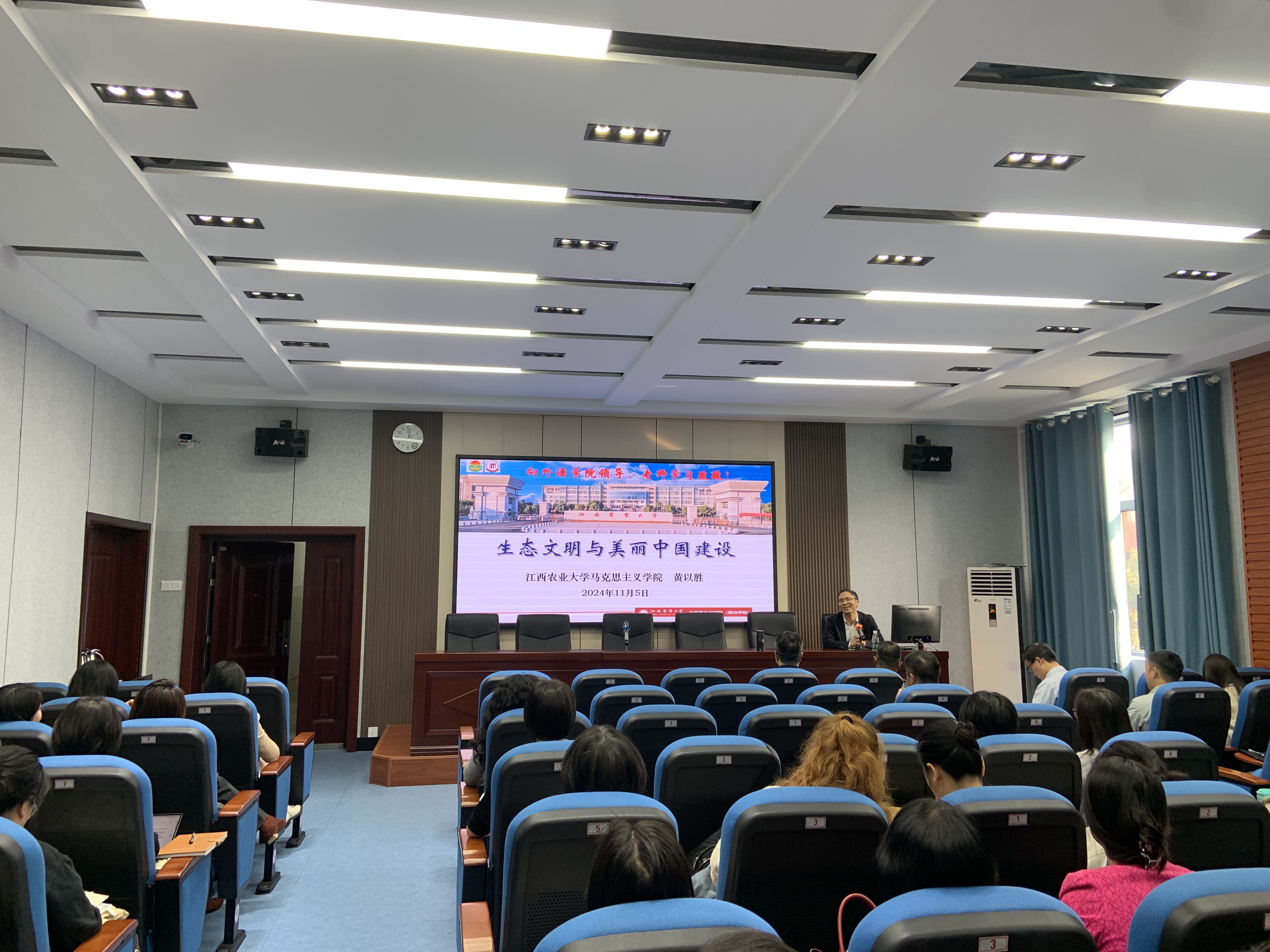 黄以胜以“生态文明与美丽中国建设”为题,结合自身专长和研究兴趣,运用丰富的案例和翔实的数据,从历史维度梳理我国生态文明建设的历程,从现实维度分析了当前我国生态文明建设面临的挑战,重点讲述了党的十八大以来我国生态文明建设取得的历史性成就,阐述了如何走好人与自然和谐共生的中国式现代化。