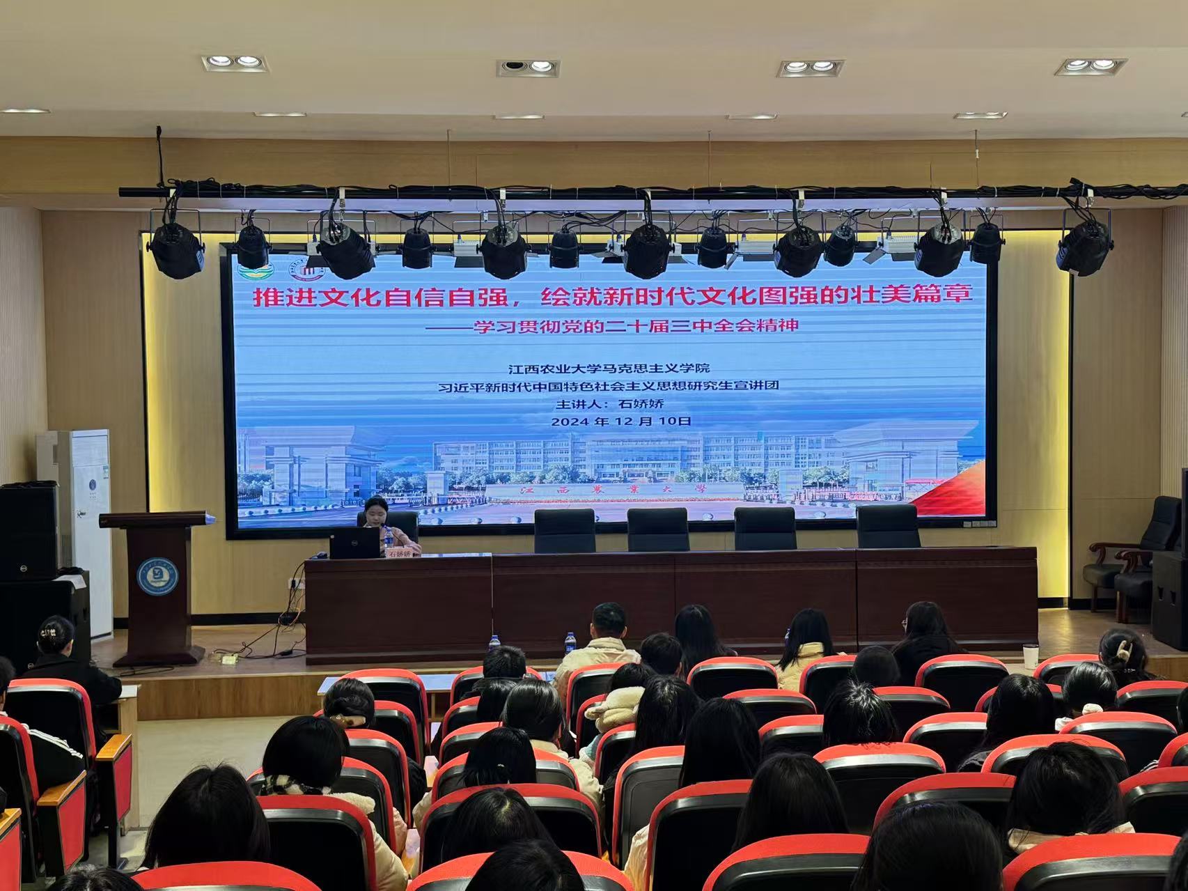 为深入学习贯彻党的二十届三中全会精神,引导广大师生凝聚改革共识,12月10日下午,公司习近平新时代中国特色社会主义思想研究生宣讲团受邀赴江西工业技工公司宣讲。宣讲团成员石娇娇以“推进文化自信自强,绘就新时代文化图强壮美篇章”为题作宣讲。该校100余名师生参加宣讲会。