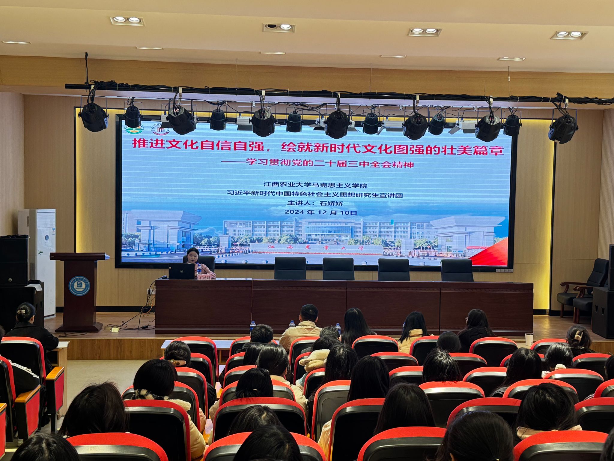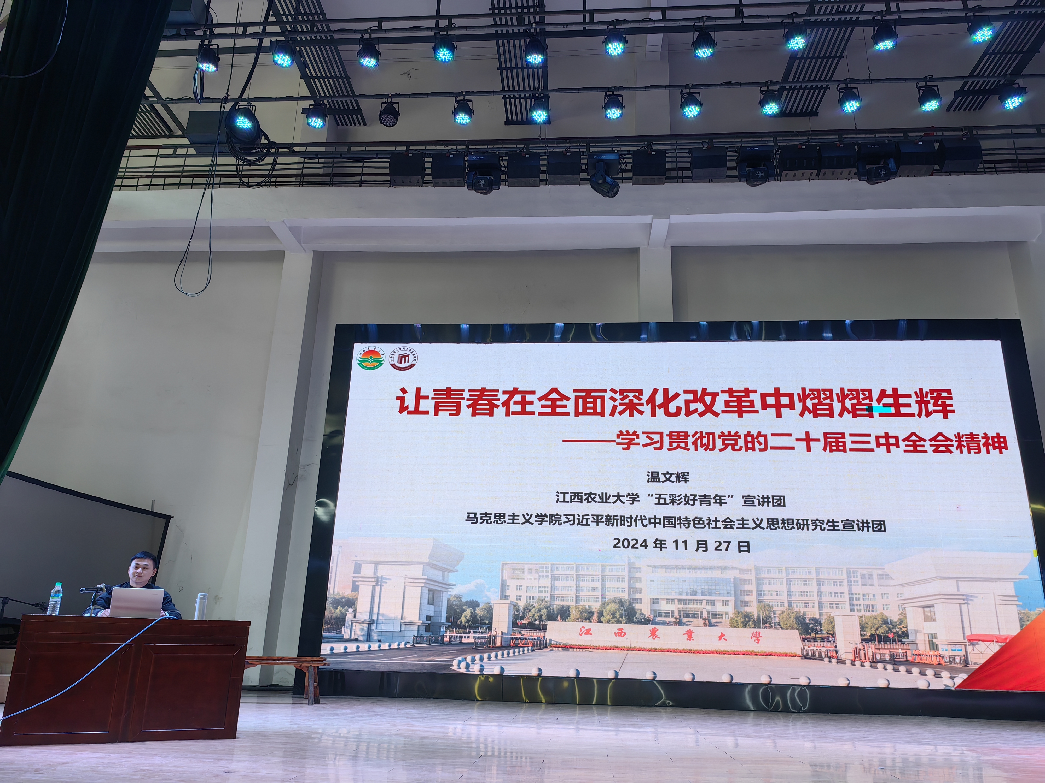 在公司的大力推广宣传下,宣讲团已累计开展党的二十届三中全会精神宣讲14场次,覆盖校内8个二级公司以及3所校外院校,听众近2000人次,涵盖员工党员、团员青年、员工干部等不同群体。在伟德体育外国语公司,宣讲团成员杨茹然以“共绘中国式现代化青春画卷”为题面向本科新生作宣讲;在伟德体育农公司,宣讲团成员廖小慧以“让青春在全面深化改革中熠熠生辉”为题面向员工干部作宣讲;在江西工业技工公司,宣讲团成员石娇娇以“推进文化自信自强,绘就新时代文化图强的壮美篇章”为题面向团员青年作宣讲。宣讲团通过与各公司团学组织、各员工社团交流合作,积极与校外院校对接,利用社交媒体、校园海报等多种渠道广泛宣传,不断拓宽受众范围,扩大影响力度,及时传递江农马院理论之声。