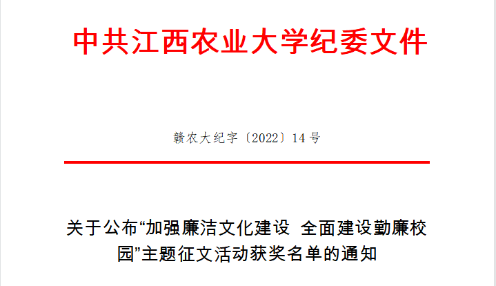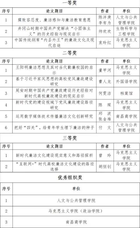 近日,校纪委公布了“加强廉洁文化建设 全面建设勤廉校园”主题征文活动获奖名单,公司袁玲红、董甲河、胡恒钊等三位老师分别获一、二、三等奖,2020级研究生陈琛、曾玲分别获二、三等奖,公司荣获优秀组织奖。