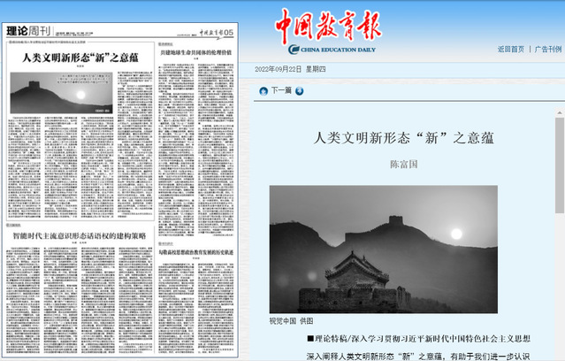 9月22日,《中国教育报》第5版(理论周刊)“深入学习贯彻习近平新时代中国特色社会主义思想”理论特稿刊发了公司陈富国教授的理论文章《人类文明新形态“新”之意蕴》,并立即被学习强国平台转载。这是公司学习宣传和研究阐释党的十九届六中全会精神和《习近平谈治国理政》第4卷的重要成果之一。
