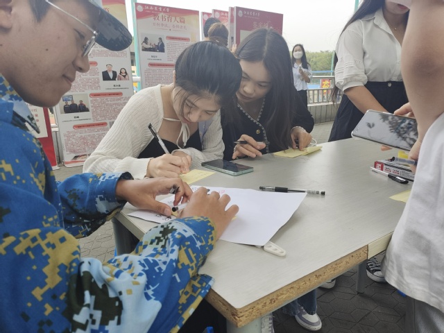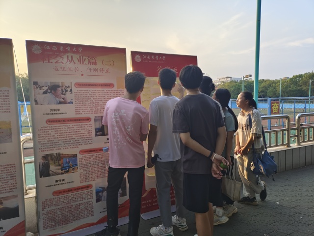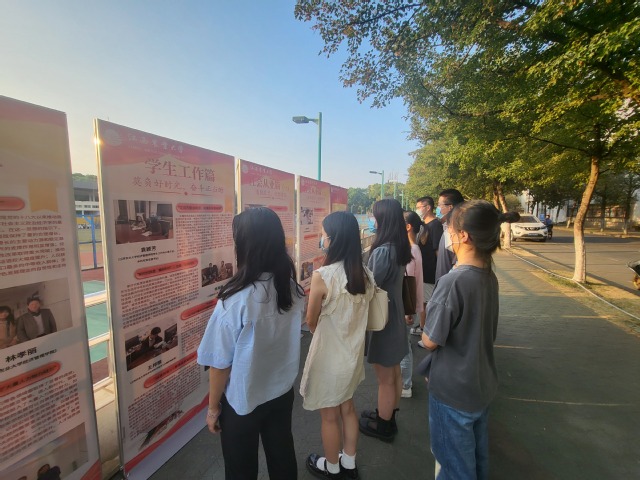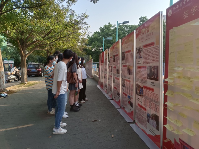 此次活动从《新时代中国特色社会主义理论与实践》课程中研究生完成的访谈报告中选取素材,选自230多位研究生采访300余人形成的200余篇访谈报告,展出内容分为“管理服务”、“教书育人”、“员工工作”、“社会从业”四个篇章,师生们纷纷驻足观看精美展板,感悟新时代发展进步,展出当天共获得参观师生在展板上留言、感悟70余条。