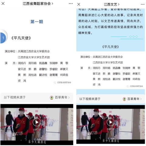目前,他所策划制作的抗疫文艺作品已被校内外多家平台推出转载。其中手势舞蹈《平凡天使》更是得到江西省文联、江西省舞蹈家协会等省级平台的关注和好评。