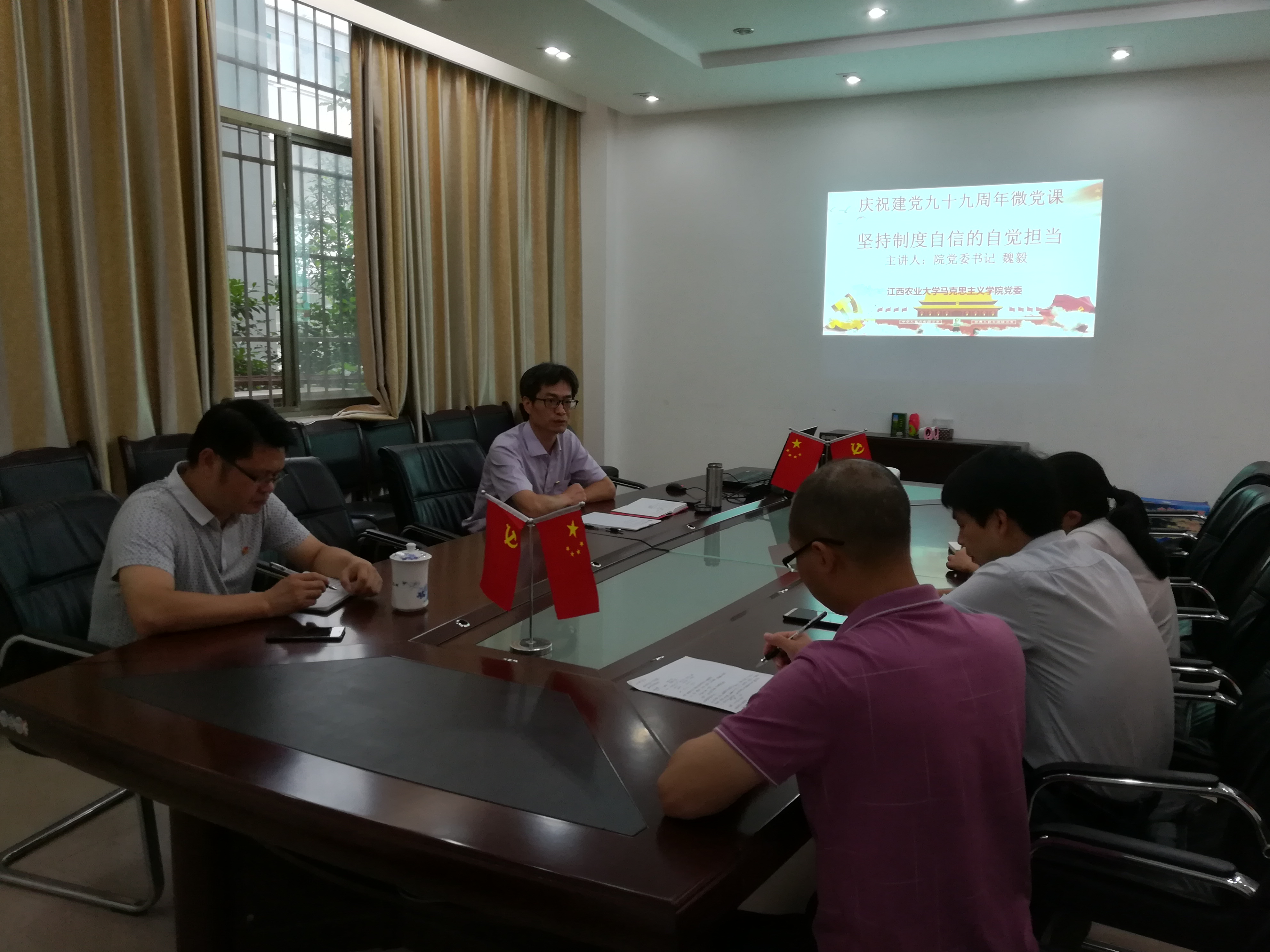 线上线下齐开讲。7月1日当天,公司党委书记魏毅以《坚持制度自信的自觉担当》带头讲党课,结合中国共产党的发展历程,分析中国特色社会主义制度自信的历史逻辑、价值逻辑和实践逻辑,号召全院师生党员在谋划公司创新发展中担当作为、践行初心使命。各党支部书记积极行动,精心撰写讲稿,通过线上或线下方式在党支部上党课,实现了支部书记讲党课、师生党员听党课的全覆盖。