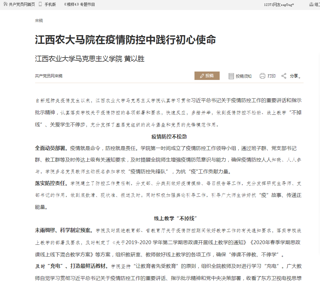 共产党员网以《江西农大马院在疫情防控中践行初心使命》为题