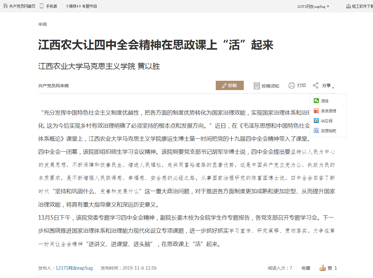共产党员网以《江西农大让四中全会精神在思政课上“活”起来》为题
