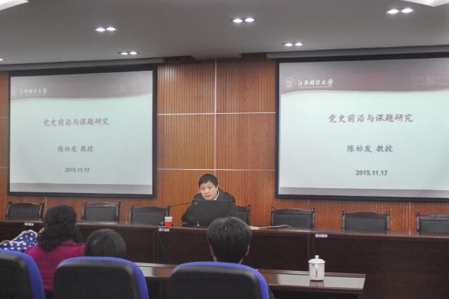 陈始发教授结合自身多年学术研究经验,先后以中国苏维埃运动的新思考、革命根据地法制建设研究的思考和党史研究选题的体会为题,指出做党史研究应尊重历史、不因人废事,首要的任务是从精神层面继承和弘扬革命精神;分析了根据地法制建设研究对科学总结党史经验与全面推进依法治国的重要性;与在场师生分享了个人课题申报和研究的经验,提出课题选题申报应注意“新、巧、透、悟”。