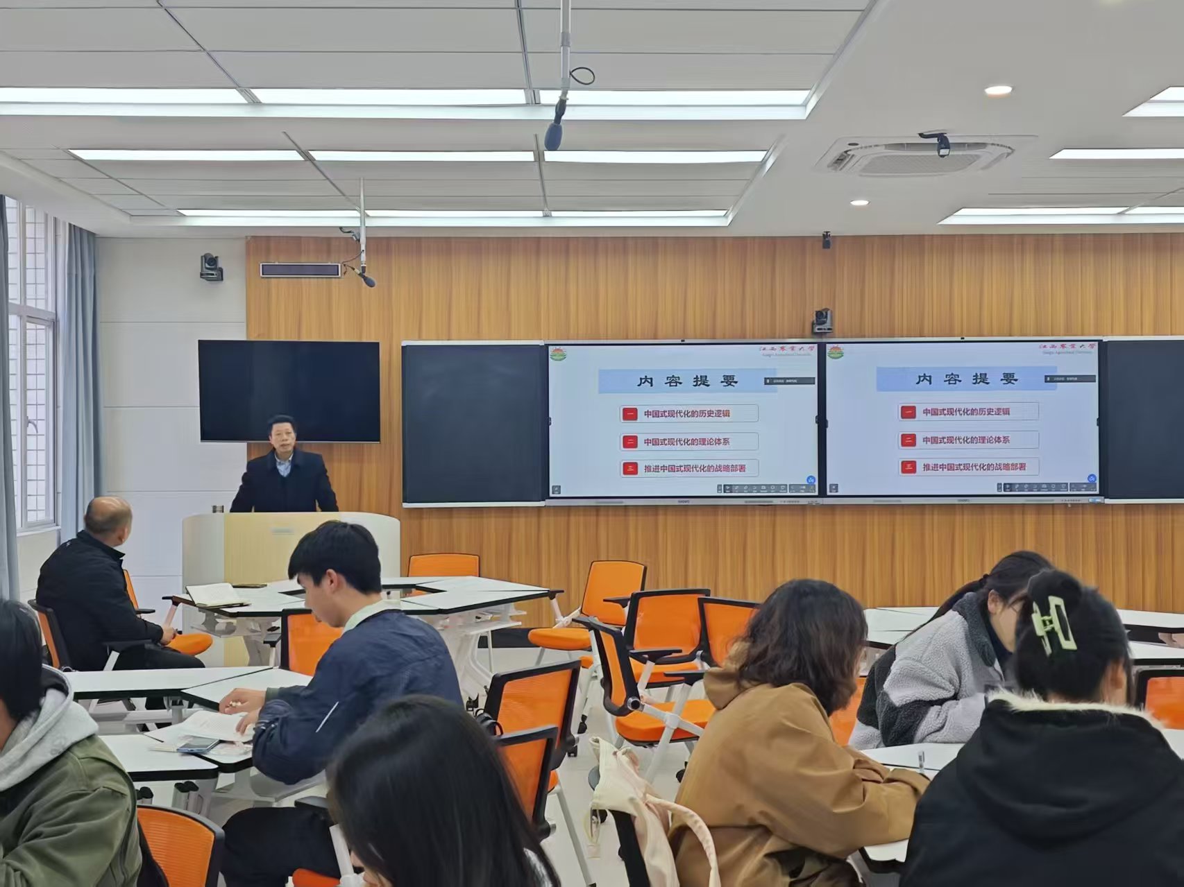 3月18日下午,《习近平新时代中国特色社会主义思想概论》课程第二讲在热烈氛围中展开。副董事长游金明教授,后勤集团副总经理、原公司派驻大余县杨梅村驻村第一书记尹晴,bevictor潘锡杨博士联袂讲授“全面建设社会主义现代化国家”专题。